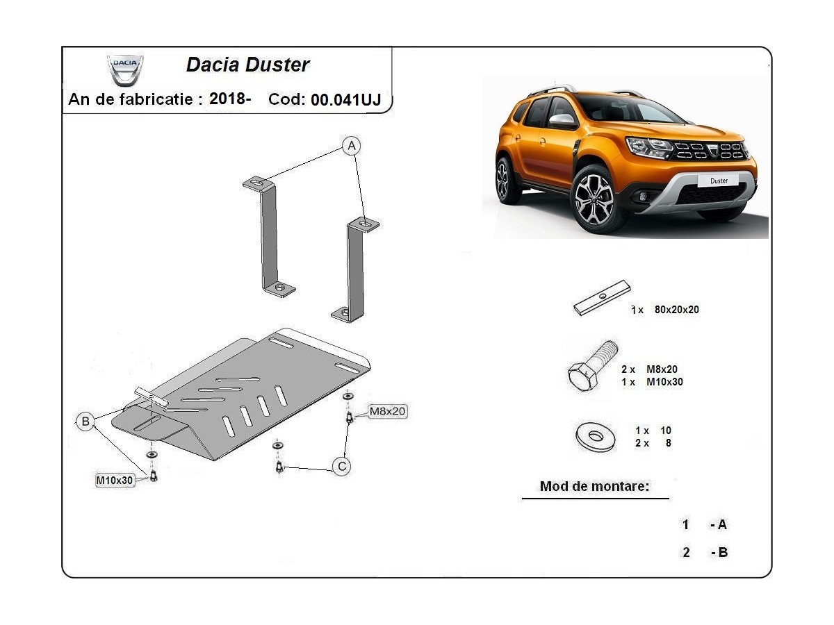 Ocelový kryt podvozku je přizpůsoben originálním montážním bodům a upevňuje se pomocí kompletní sady plechů, šroubů a matic.