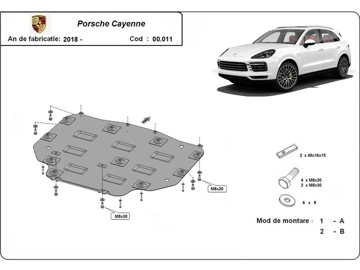 Ocelový kryt podvozku je přizpůsoben originálním montážním bodům a upevňuje se pomocí kompletní sady plechů, šroubů a matic.